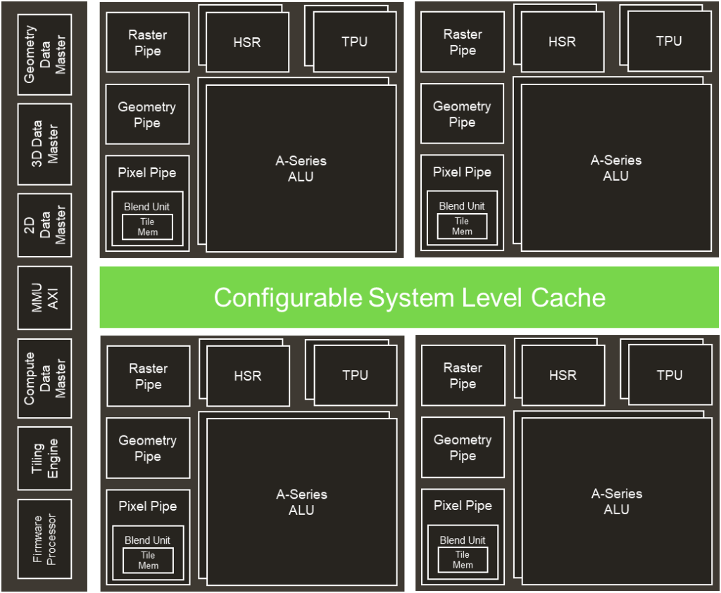 A-Series GPUs now contain cache configurability options. This allows implementers to significantly reduce GPU bandwidth requirements. This provides flexibility to reduce power, thermals and system cost.