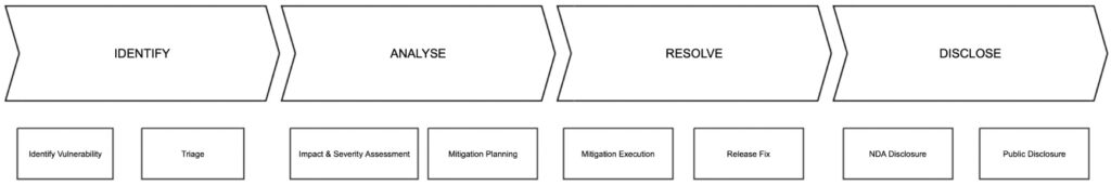 - Identify Vulnerability: Potential vulnerabilities from internal or external reporters are logged and the reference ID assigned. At this stage, a uniquely identifiable reference ID will be allocated to the issue.