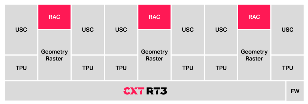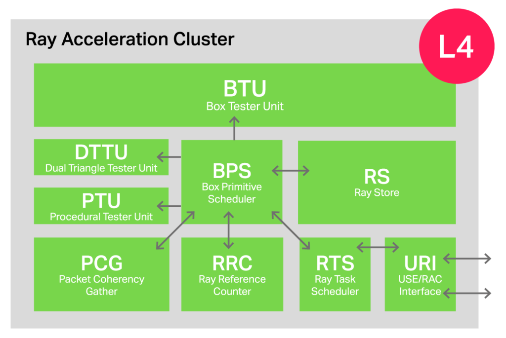 The RAC fully offloads the highly divergent recursive process of tracing each ray through the bounding volume hierarchy (BVH). The hardware includes dedicated ray ram storage and multiple scheduling engines to handle this process in a power, processing, and bandwidth-efficient way.